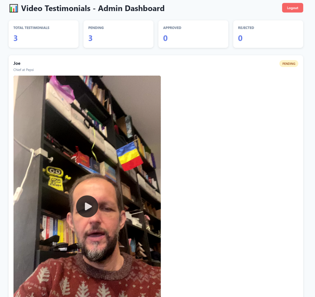 The admin (you) receive an email notification via SMTP that you have a new video testimonial.